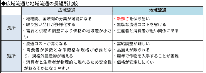 下記に私が考える広域流通と地場(地域)流通の長短所をまとめておく。